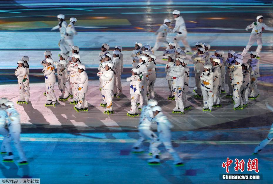 当地时间2月25日,2018平昌冬奥会闭幕式在平昌奥林匹克体育场举行,现场演出精彩夺目。图为闭幕式现场的文艺演出。