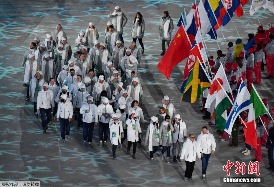 当地时间2月25日,2018平昌冬奥会闭幕式在平昌奥林匹克体育场举行,现场演出精彩夺目。图为俄罗斯运动员参加闭幕式。