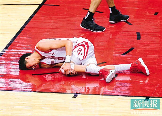 ■10月9日,在与上海大鲨鱼队的季前赛中,休斯敦火箭队球员周琦在比赛中左膝受伤。 新华社发