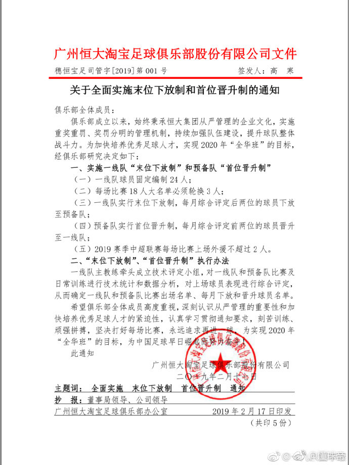 2月17日下午,广州恒大淘宝足球俱乐部下发了《关于全面实施末位下放制和首位晋升制的通知》(下文简称“通知”)。该“通知”称:为了加快培养优秀足球人才,实现2020年“全华班”的目标,俱乐部研究决定,实施一线队“末位下放制”和预备队“首位晋升制”。该“通知”还指出,2019赛季中超联赛,恒大队每一场比赛上场外援人数不超过2人。