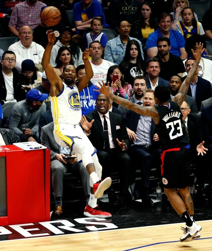 ↑4月18日,勇士队球员杜兰特 (前左)在比赛中救球。